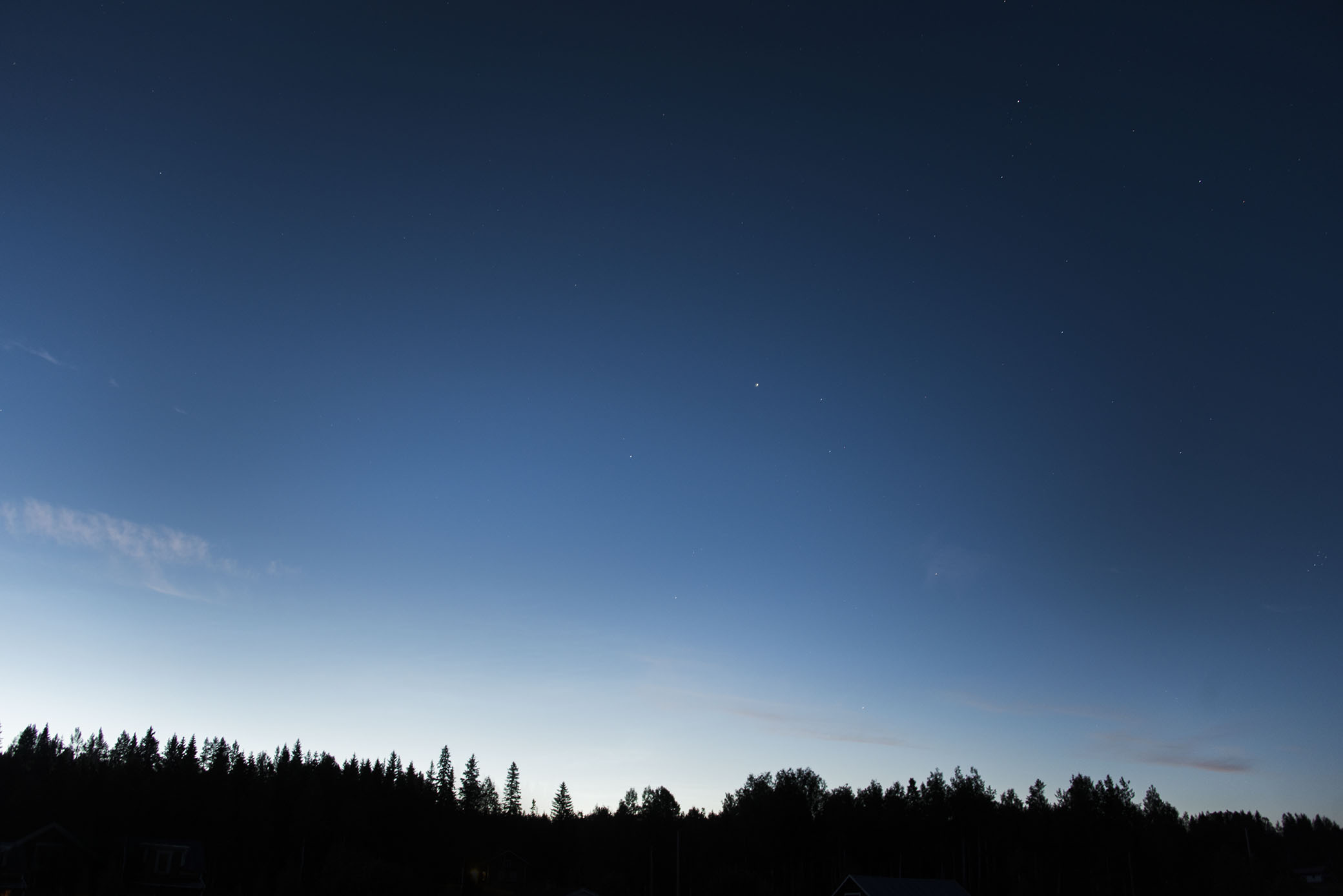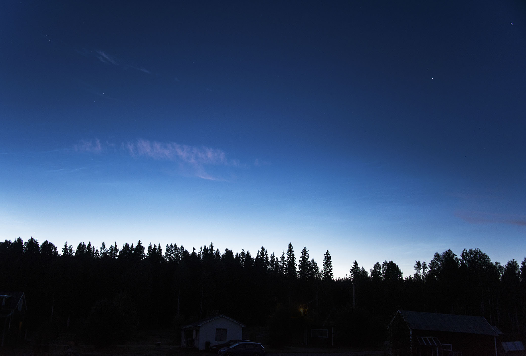 Det var mitt i natten, och när låten började spelas så släppte jag penslarna och reste mig upp. Jag gick fram till fönstret och blickade ut. I samma veva som första meningen sjöngs i den vackraste stämma man kan tänka sig, så såg jag den allra första stjärnan på himlen. Jag rös. Jag har inte sett stjärnorna sedan i maj. Himlen var skymningsblå, och ovanför trädtopparna lyste ljuset av solen som sedan länge gått ner och skapat en morgon någon annanstans på jorden. Jag tittade upp mot stjärnan och kände återigen tårarna i ögonen. Musiken, stämningen, natten. Allt var så obeskrivligt vackert. Sedan gick jag ut med kameran för att fota sensommarens första stjärnhimmel.