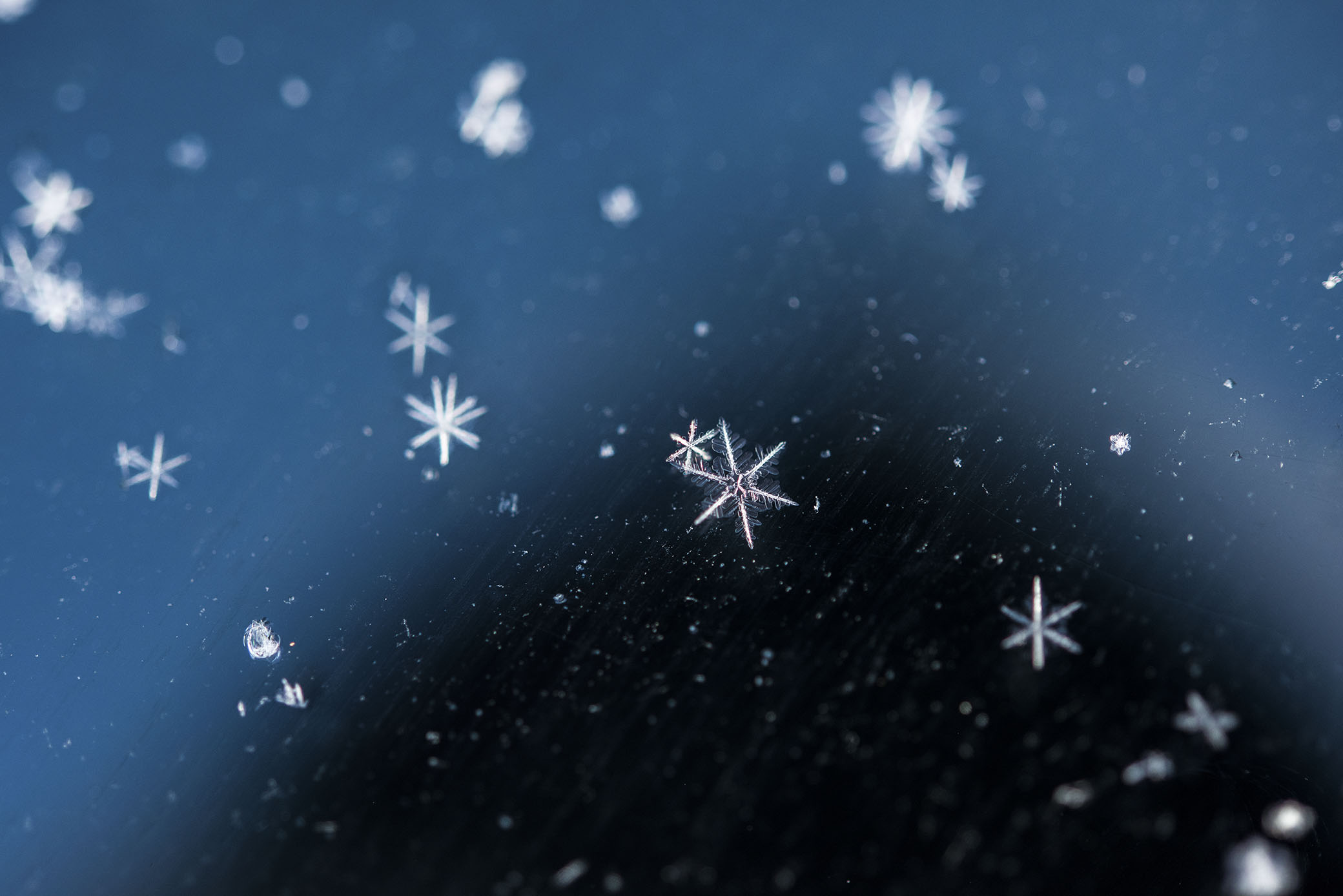 Jag tog bilderna av snöflingorna på bilrutan. Där syns de så extra tydligt.